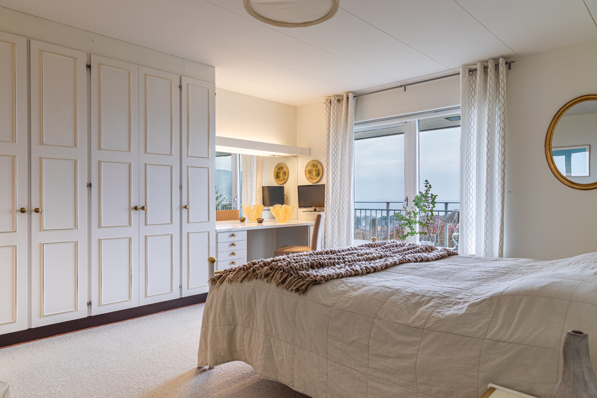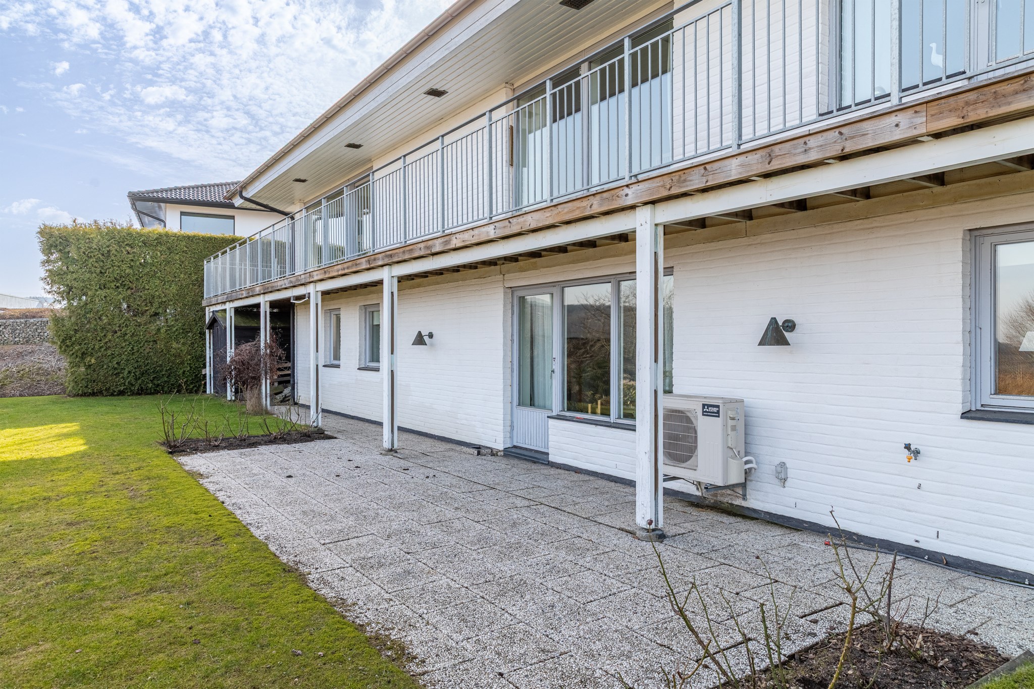 Inbyggt uterum med glaspartier mot öster och norr.BilplatsCarport för en bil samt ytterligare bilplatser på stensatt infart.TV- och internetanslutning
